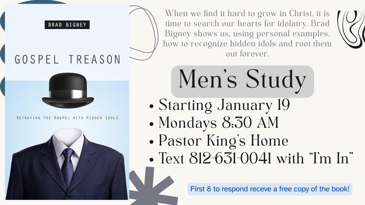 If you're interested in joing a men's Bible study or finding out more about our ongoing men's ministry activities please fill out this form and we will get in contact with you shortly.